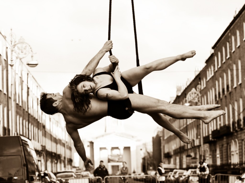 Pursuing a labour of love is a tough business, as any creative or media individual will tell you. It is quite something else, then, to effectively blaze the trail for it in your home country. For Cork musician Jym Daly and Donegal dancer Chantal McCormick-Daly, it’s been a consuming passion to establish their company Fidget Feet, and bring the thrill of aerial dance to essentially a new audience, one largely built up from scratch in their own case. It’s a process Chantal is evidently proud of. “Fidget Feet received its first commission in 2004 from Customs House in Newcastle, in the UK, to create a solo show called I Can’t Handle Me. Previous to this, we toured Ireland with support from local arts offices, to village halls, churches, anywhere that would take us, with our first shows in 1998. I trained in dance in the UK, and the reason we set up Fidget Feet is we wanted to move home to Ireland, be the first aerial dance company here, and bring what we’ve learnt in the UK to Ireland. We had to wait till Circus became a recognised artform by the Arts Council, before we could move home in 2007. Since then we’re now the leading aerial dance company in Ireland, funded by Arts Council, Culture Ireland, Donegal County Council & Limerick City & County Council. We’re the resident company at Irish World Academy of Music & Dance at the University of Limerick, & our permanent home is at the Irish Aerial Creation Centre.”